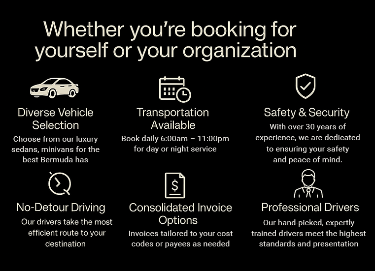 Executive Transport Ltd. sets the standard for corporate transportation in Bermuda. We specialize in delivering premium, executive-level travel experiences with a focus on comfort, professionalism, and innovation. Whether youβre arriving for business, leisure, or a special event, our fleet of limousines, taxis, vans, and private buses ensures a first-class journey from start to finish.